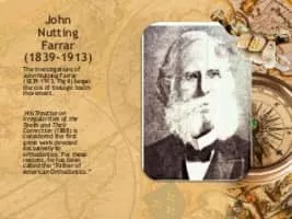 John Nutting Farrar was an American dentist who is considered to be "Father of American Orthodontics". He published several of his works in Dental Cosmos, and they are known to be monumental for the field of Orthodontics at that time.
