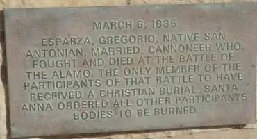 José Gregorio Esparza, also known as Gregorio Esparza, was the last Texan defender to enter the Alamo during the early days of March 1836 in the Siege of the Alamo and was the only one that was not burned in the pyres. He had brought his family into the Alamo compound along with him.