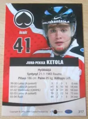 Juha-Pekka Ketola is a Finnish former professional ice hockey centre. Born in Rauma, Ketola began his playing career at junior level with his hometown team Lukko, during which he was drafted 287th overall by the New York Islanders in the 2001 NHL Entry Draft.