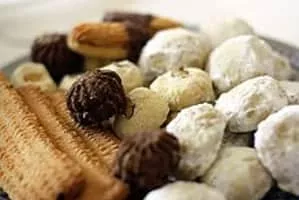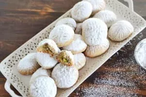 Kahk, or Ka'ak al-Eid, is a small circular biscuit eaten by Egyptians and Sudanese people to celebrate Eid al-Fitr and Easter. It is covered with powdered sugar and can be stuffed with ‘agameya, lokum, walnuts, pistachios, or dates, or simply served plain.