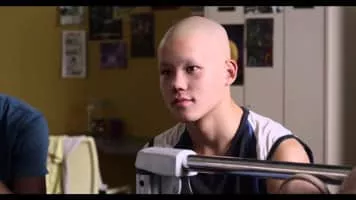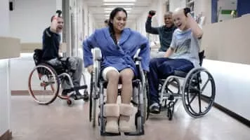 Three teenagers appear to have lots of fun in the children's oncology area on the fourth floor of a large hospital.