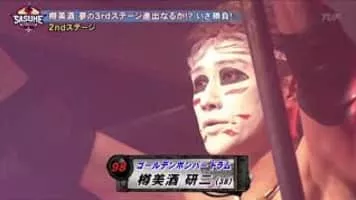 Darvish Kenji (樽美酒 研二), is a drummer for the Japanese rock band, Golden Bomber. He is currently regarded as one of the most consistent celebrities to compete in the current era of SASUKE. Darvish would make his first appearance in SASUKE 28 where he failed the Rolling Escargot.