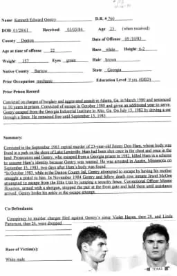 Kenneth Edward Gentry was an American criminal who was executed on April 16, 1997 for the murder of 23-year-old Jimmy Don Ham. The crime took place in Lewisville, Texas in 1983, technically Pilot Point.