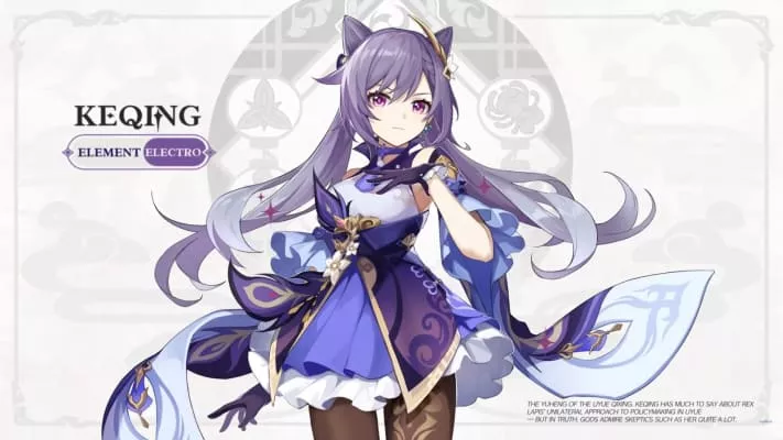 Keqing (Chinese: 刻晴 Kèqíng) is a playable Electro character in Genshin Impact. As the Yuheng of the Liyue Qixing, she is someone who seeks her own answers instead of idly letting chaos run amok in Liyue. She chooses her own path with her own power and ability, instead of letting the gods determine her fate.