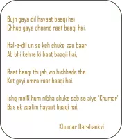 Khumār Barabankvi Urdu: خُمار بارہ بنکوی was an Urdu poet and lyricist from Barabanki, Uttar Pradesh, India. His real name was Mohammed Haidar Khan, The word comes from the Arabic root 'Khum' which means a jar of wine.