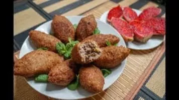 Kibbeh, is a Levantine dish made of bulgur, minced onions, and finely ground lean beef, lamb, goat, or camel meat with Middle Eastern spices. Other types of kibbeh may be shaped into balls or patties, and baked, cooked in broth, or served raw.