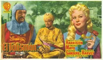 Sir Kenneth (Laurence Harvey) flirts with Lady Edith (Virginia Mayo) as Richard I and company face a sultan's (Rex Harrison) army and go for the Grail.