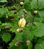 Kirengeshoma is a genus containing two species of plants in the hydrangea family. Both are clump-forming perennials native to Eastern Asia, with sycamore-like palmate leaves and nodding, waxy yellow flowers on slender stalks, growing in shady environments.