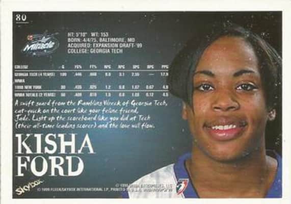 Kisha Ford is a former WNBA player for the New York Liberty, Orlando Miracle, and the Miami Sol. She attended Bryn Mawr School and played college basketball at Georgia Tech, where she was the all-time leading scorer in team history.