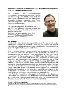 Klaus-Dieter Altmeppen is Professor of Journalism in the School of Journalism at the Catholic University (CU) Eichstaett-Ingolstadt in Germany. His research focuses on the area of media (economics, management, and organisations). ...