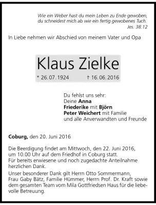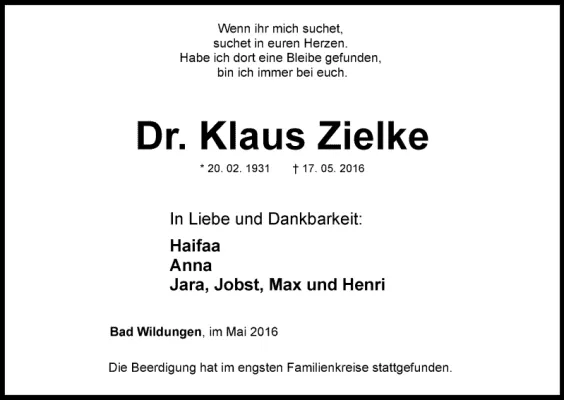 Klaus Zielke (* 20. Februar 1931 in Berlin; † 17. Mai 2016 in Bad Wildungen) war ein deutscher Orthopäde. In Deutschland ist er der Pionier der operativen Behandlung von Verformungen der Wirbelsäule.* 20. Februar 1931 in Berlin; † 17. Mai 2016 in Bad Wildungen