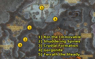Kor the Immovable is an elite earth elemental located in Shuddering Spires, northwest of Temple of Earth within Deepholm. He's within close proximity to Berracite.