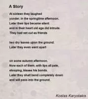 Kostas Karyotakis is considered one of the most representative Greek poets of the 1920s and one of the first poets to use iconoclastic themes in Greece. His poetry conveys a great deal of nature, imagery and traces of expressionism and surrealism. He also belongs to the Greek Lost Generation movement.