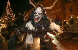 In Central European folklore, Krampus is a horned, anthropomorphic figure described as "half-goat, half-demon", who, during the Christmas season, punishes children who have misbehaved, in contrast with Saint Nicholas, who rewards the well-behaved with gifts.