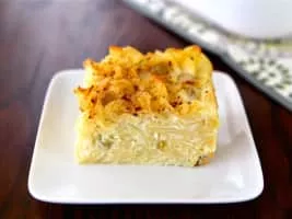 Kugel is a baked pudding or casserole, most commonly made from egg noodles or potato. It is a traditional Ashkenazi Jewish dish, often served on Shabbat and Yom Tov.