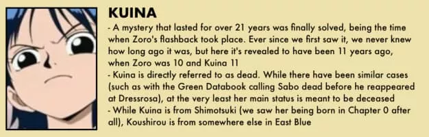 Kuina was the late childhood friend and rival of Zoro. She was the daughter of Koushirou and was the reason why Zoro developed the Santoryu technique.
