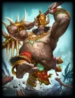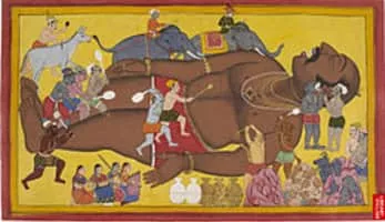 Kumbhakarna is a powerful rakshasa and younger brother of Ravana from the Hindu epic Ramayana. Despite his gigantic size and appetite, he is described as a virtuous character and a great warrior in Hindu texts. He is said to have slaughtered 8,000 vanaras over the course of Rama's mission to rescue Sita.