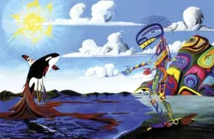 Lawrence Paul Yuxweluptun is a Cowichan/Syilx First Nations contemporary artist from Canada. His paintings employ elements of Northwest Coast formline design and Surrealism to explore issues as environmentalism, land ownership, and Canada's treatment of First Nations peoples.