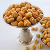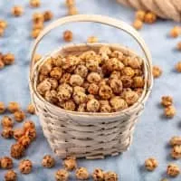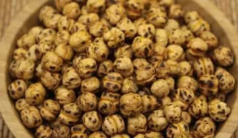 Leblebi is a snack made from roasted chickpeas, common and popular in Afghanistan, Iran, Syria and Turkey, and sometimes seasoned with salt, hot spices, dried cloves, or candy coated. In Tunisia it the term refers to a very popular chickpea based breakfast soup which also includes egg and stale bread.