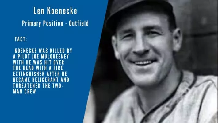 Leonard George Koenecke was an American baseball player who played Major League Baseball for the Brooklyn Dodgers and the New York Giants. He died of a blow to the head at the hands of the pilot and a passenger of a plane of which he had seized control.