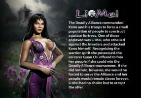 Li Mei is a Mortal Kombat character and a resident of Outworld that first appeared in Mortal Kombat: Deadly Alliance. She was also among the relative few Deadly Alliance newcomers to appear in both Mortal Kombat: Deception and Mortal Kombat: Armageddon.