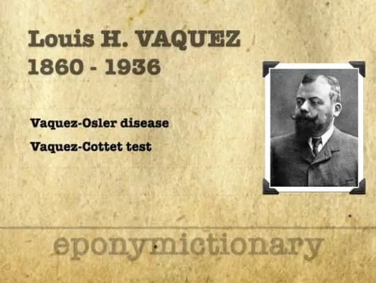 Louis Henri Vaquez was a French internist born in Paris. He is known for his work in the field of hematology and his research of heart disease. In 1890 he earned his medical doctorate, and in 1895 became médecin des hôpitaux in Paris.