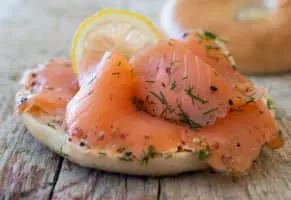 Lox is a fillet of brined salmon. Lox is one type of salmon product served on a bagel with cream cheese, and is usually garnished with tomato, sliced onion, cucumbers, and sometimes capers. The other type of salmon product is smoked salmon.