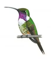 The lucifer sheartail or lucifer hummingbird is a medium-sized, up to 10 cm long, green hummingbird with long decurved bill, small wings and white streak behind eye. The male has an iridescent plumage, forked dark tail, green crown, long magenta gorget and white underparts.