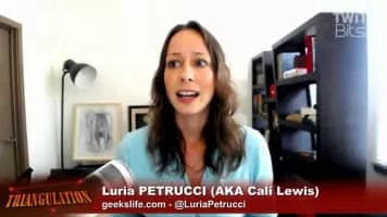 Luria Petrucci, also known as Cali Lewis, is an American podcaster and Internet personality best known for her podcasts GeekBeat. TV, GeekBrief. TV, and GeekBeat LIVE, and her guest host role on Call for Help. In 2007 she made a cameo appearance in a TV commercial for GoDaddy. com which aired during the Super Bowl.