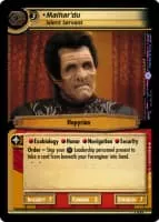 Maihar'du was the Hupyrian servant of former Grand Nagus Zek. Maihar'du had taken a vow of silence and was only permitted to speak to the Nagus. He was very imposing and was not only a servant, but a bodyguard and food taster. He was also the flight controller to Zek's personal shuttle.