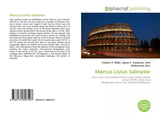 Marcus Livius Salinator was a Roman general and politician who fought in the Second Punic War, most notably during the Battle of the Metaurus. Born in 254 BC, Livius was elected consul of the Roman Republic with Lucius Aemilius Paulus shortly before the Second Illyrian War in 219 BC.