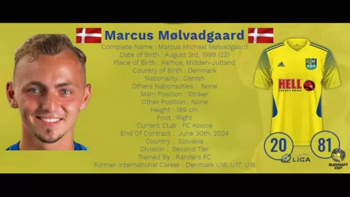 Marcus Mølvadgaard is a Danish footballer who plays as a forward for Slovak 2. liga-side FC Košice.