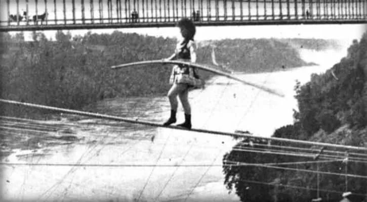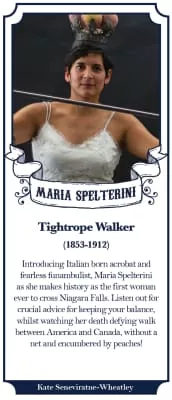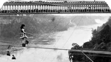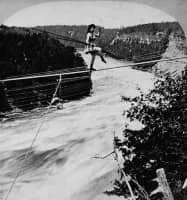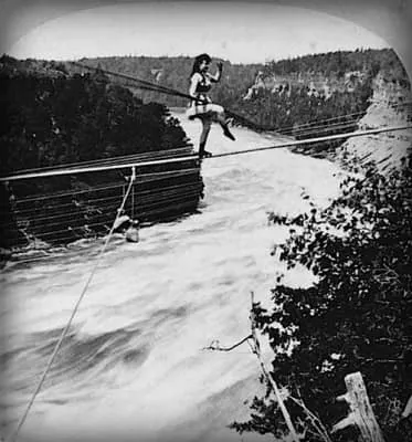 Maria Spelterini was an Italian tightrope walker who was the only woman to cross the Niagara gorge on a tightrope, which she did on July 8, 1876 as part of a celebration of the U.S. Centennial. She used two and a quarter inch wire and crossed just north of the lower suspension bridge.
