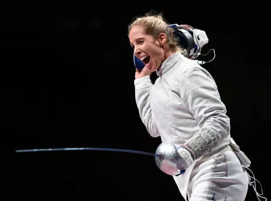 Mariel Leigh Zagunis is an American sabre fencer. She is a two-time Olympic champion in the individual sabre and the first American to win a gold medal in Olympic fencing. She was Team USA flag bearer in the 2012 Summer Olympics Parade of Nations. She has two Olympic bronze team medals and is a five-time Olympian.