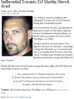 Martin Streek was a Canadian radio DJ known for his work on CFNY-FM in Toronto, Ontario. His on-air duties included hosting the Thursday 30, live-to-air from the Phoenix nightclub, and live-to-air from the Velvet Underground. He died by suicide on July 6, 2009.