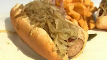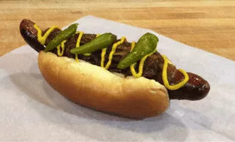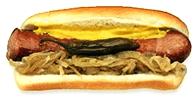 A Maxwell Street Polish consists of a grilled or fried length of Polish sausage topped with grilled onions and yellow mustard and optional pickled whole, green sport peppers, served on a bun.