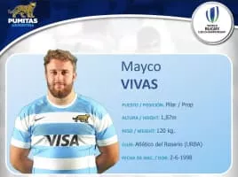 Mayco Vivas is an Argentine rugby union player who plays for the Jaguares. On 28 December 2018, Vivas was named in the Jaguares squad for the 2019 Super Rugby season. His playing position is prop. On 5 October 2022, Vivas travels to England to join Gloucester in the Premiership Rugby from the 2022-23 season.
