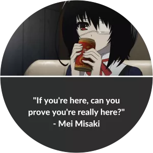 Mei Misaki (見崎 鳴, Misaki Mei) is the female protagonist of Another and a student of Class 3-3 at Yomiyama North Middle School in 1998. She was labeled by her classmates as "the one that does not exist."