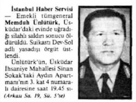 Memduh Ünlütürk was a Turkish general associated with the Counter-Guerrilla and the anti-communist Ziverbey interrogations following the 1971 coup. He was assassinated at his Istanbul home by members of the left-wing revolutionary group Dev Sol.
