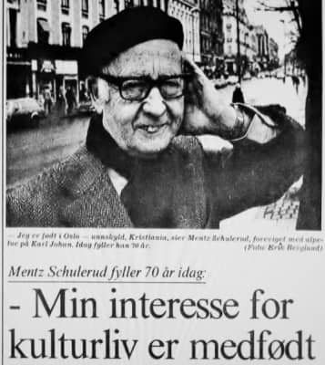 Mentz Schulerud was a Norwegian author, radio personality and theatre director. He was known for his encyclopaedic knowledge of the city of Oslo. Schulerud was born in Kristiania, but grew up in Rena, Lillehammer and Ringsaker as the older brother of the famous children's book author Anne-Cath. Vestly.