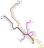 Metro Bilbao is a rapid transit system serving the city of Bilbao and the region of Greater Bilbao. Lines 1 and 2 have a "Y" shape, as they transit both banks of the Nervión river and then combine to form one line that ends in the south of Bilbao.