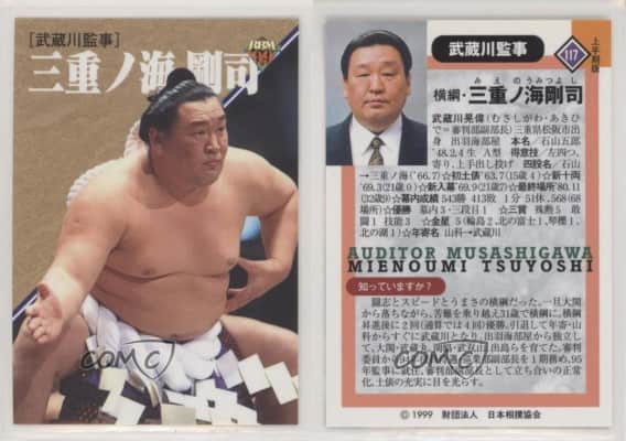 Mienoumi Tsuyoshi is a Japanese former professional sumo wrestler from Matsusaka, Mie. He was the 57th yokozuna of the sport. After retiring he founded the Musashigawa stable and was a chairman of the Japan Sumo Association.