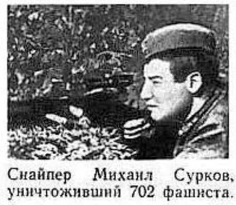Mikhail Ilyich Surkov was a Soviet sniper in the 4th Rifle Division of the Red Army during World War II. He was born in a Siberian town of Bol'shay Salyr' next to Krasnoyarsk and hailed from a family of hunters and fur-trappers.