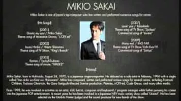 Mikio Sakai is a Japanese singer-songwriter. His real name is Mikirō Sakai. He made his debut with the single Ima dake wa Kimi wo Hanasanai.