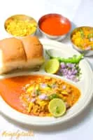 Misal pav is a popular dish from Maharashtra, India. It consists of misal and pav. The final dish is topped with farsan or sev, onions, lemon and coriander. It is usually served with bread or rolls toasted with butter and buttermilk or curd and papad.