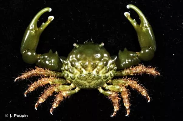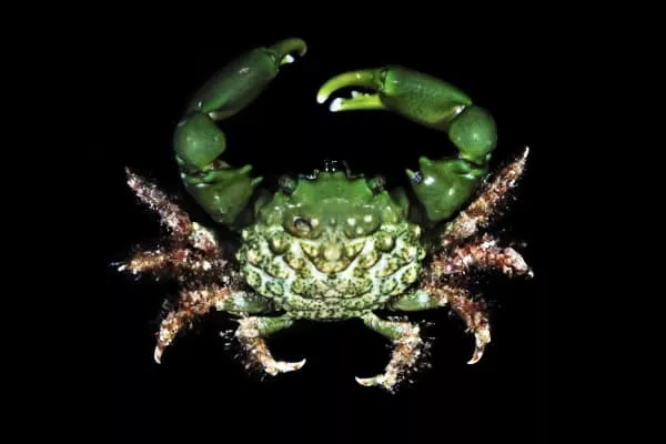 Mithraculus sculptus, the green clinging crab or emerald crab, is a species of crab in the family Majidae. It is a dark green colour and is found in tropical waters in the Caribbean Sea. It is sometimes kept in reef aquaria.