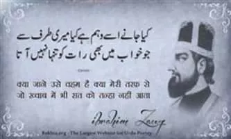 Sheikh Muhammad Ibrahim Zauq was an Urdu poet and scholar of literature, poetry and religion. He wrote poetry under nom de plume "Zauq", and was appointed poet laureate of the Mughal Court in Delhi just at the age of 19.