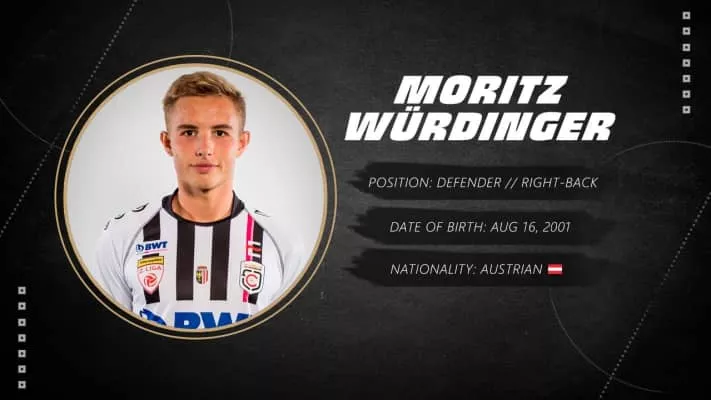 Moritz Würdinger (AUT) is a ball winning defender and currently plays for Pasching. Moritz Würdinger is 20 years old (2001/08/16). His preferred foot is Right. His jersey number is 13. Moritz Würdinger has also been used as a ball playing defender, a stopper and as a defensive back.AUT