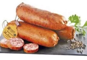 The Morteau sausage is a traditional smoked sausage from the Franche-Comté French historical region and take its name from the city of Morteau in the Doubs department. It is smoked in traditional pyramidal chimneys, called "tuyés". It is a strongly flavoured and very dense uncooked sausage.