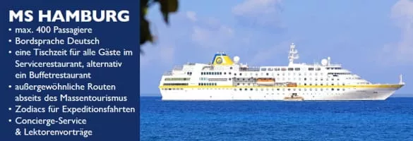 MS Hamburg is a 15,000-ton, 420 passenger, luxury cruise ship owned by the Conti Group and is now operated by Plantours Kreuzfahrten. She was built in 1997, in Wismar, Germany.